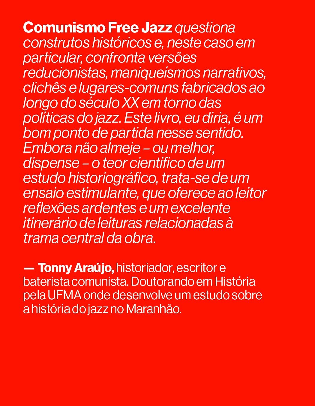 O historiador maranhense Tonny Araújo assina o prefácio da edição brasileira de Comunismo Free Jazz , originalmente editada pelo sociólogo Sezgin Boynik e pelo músico e pesquisador Taneli Viitahuhta, que está sendo lançada no Brasil pela editora paulistana Sob Influência.