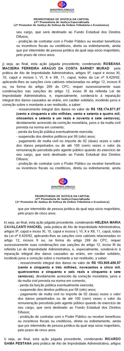 O Procurador pede que a ex-governadora seja condenada pela prática de Ato de Improbidade Administrativa, artigos 9º, caput e inciso XI, 10, caput e incisos I, VI, X e XII, 11, caput, todos da Lei nº 8.429/92, aplicando-lhes as sanções civis cabíveis relacionadas no artigo 12, incisos II ou, na forma do artigo 289 do CPC, requer sucessivamente suas condenações nas sanções do artigo 12, inciso III da referida Lei de Improbidade Administrativa, e, especialmente, condená-lo à reparação integral dos danos causados ao erário, em caráter solidário, incidindo juros e correção sobre o montante a ser restituído, a saber: