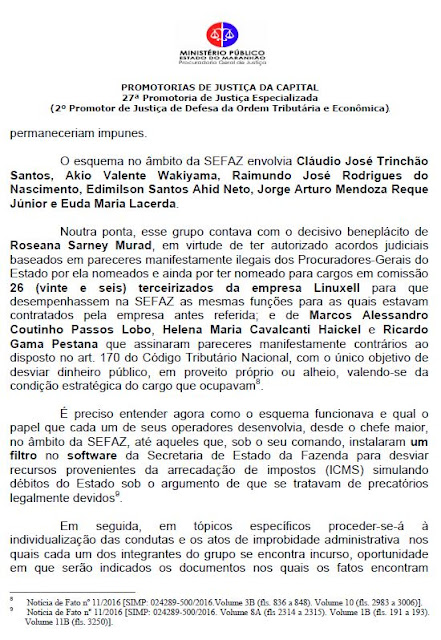 Noutra ponta, esse grupo contava com o decisivo beneplácito de Roseana Sarney Murad, em virtude de ter autorizado acordos judiciais baseados em pareceres manifestamente ilegais dos Procuradores-Gerais do Estado por ela nomeados e ainda por ter nomeado para cargos em comissão 26 (vinte e seis) terceirizados da empresa Linuxell para que desempenhassem na SEFAZ as mesmas funções para as quais estavam contratados pela empresa antes referida; e de Marcos Alessandro Coutinho Passos Lobo, Helena Maria Cavalcanti Haickel e Ricardo Gama Pestana que assinaram pareceres manifestamente contrários ao disposto no art. 170 do Código Tributário Nacional, com o único objetivo de desviar dinheiro público, em proveito próprio ou alheio, valendo-se da condição estratégica do cargo que ocupavam.