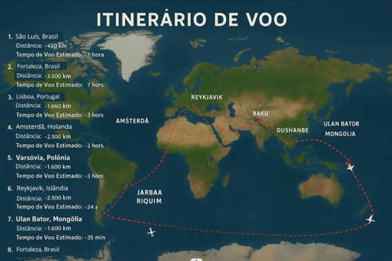 O roteiro, cuidadosamente planejado, parte de São Luís e segue por Fortaleza, Amsterdam, Reykjavik, Varsóvia, Baku, Dushanbe, Toshkent, Bishkek, Almaty, Ulan Bator, Pequim, Riadee Istambul. A jornada deve durar 31 dias, com passagens por dez países inéditos, somando 161 na lista total de Luiz Thadeu — um feito que poucos viajantes brasileiros alcançaram.