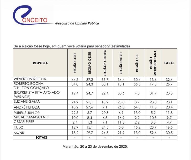 Levantamento do Instituto Conceito Pesquisa, realizado entre os dias 20 e 23 de dezembro de 2025, revela um cenário cada vez mais competitivo na disputa pelo Senado no Maranhão e evidencia o avanço do nome de Hilton Gonçalo, ex-prefeito de Santa Rita, no cenário estadual, quando colocado como o nome de Eduardo Braide para a disputa.