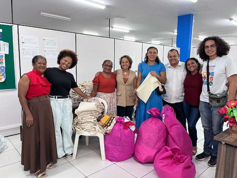 Jacilene Abreu e integrantes do grupo Mãos Virtuosas, entregando a encomenda de 800 ecobags feitas por elas, na Mãe Chica, ao time da Secretaria de Estado do Trabalho e Economia Solidária